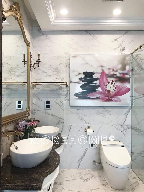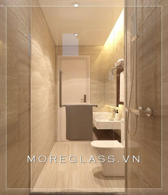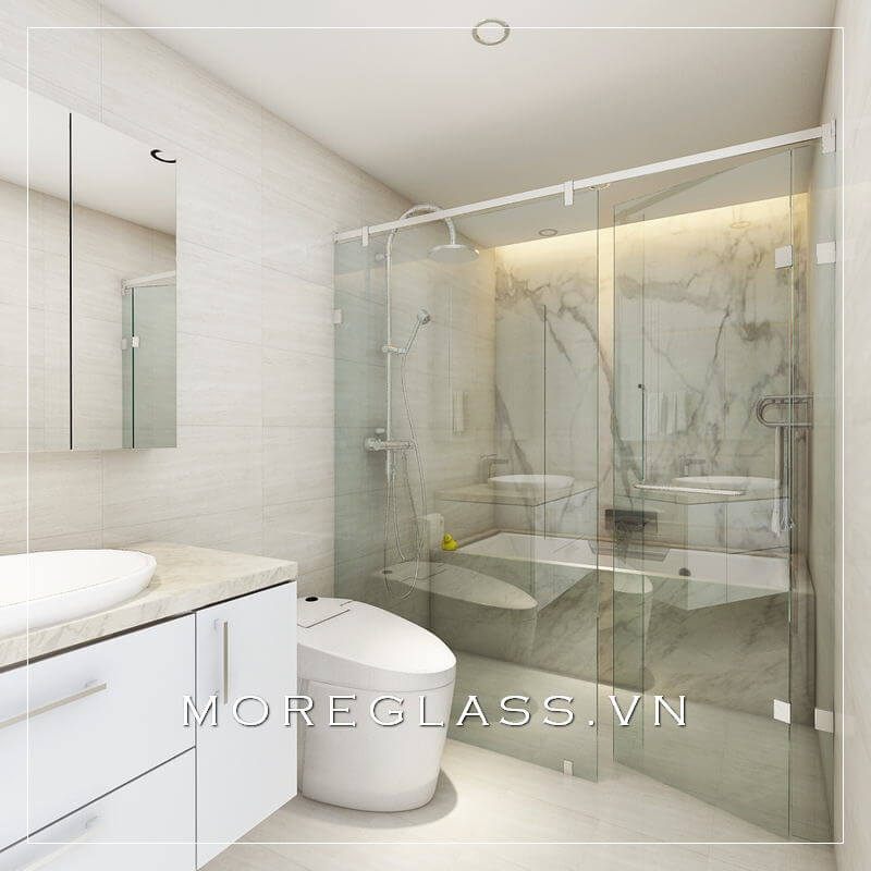 Chung cư được trang bị một phòng tắm nhỏ với sử dụng vách kính nhà tắm để tách riêng không gian tắm và khu vệ sinh, giúp cung cấp cho căn phòng tắm tiện nghi hơn.