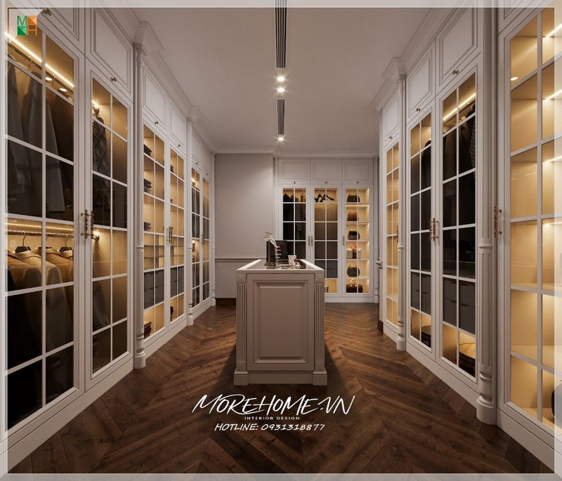 Thiết kế phòng thay đồ với hệ thống tủ quần áo kịch trần cánh kính sắp xếp hợp lý, bố trí đèn led chiếu sáng khiến cho việc lưu trữ tìm kiếm đồ trở nên nhanh chóng dễ dàng, và cũng khiến tổng thể không gian phòng thay đồ trở nên sang trọng, cao cấp