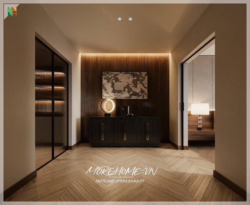 Vẻ đẹp hoàn hảo của Phòng Ngủ Master gỗ óc chó được tôn lên bởi Sàn gỗ, bộ bàn ghế trang điểm, tủ quần áo, kệ tivi và cửa gỗ, trở thành điểm nhấn của căn phòng.