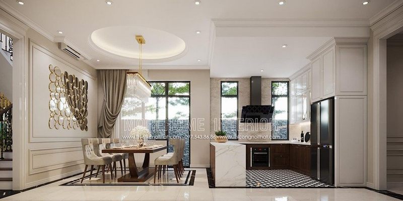 Khu vực bếp nấu và bồn rửa được bố trí riêng biệt tại đảo bếp, giúp cho việc sử dụng tiện lợi và còn mang lại yếu tố phong thủy tốt cho gia chủ.