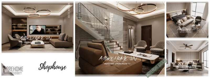 Không gian phòng khách nhà phố đầy hấp dẫn với tâm điểm là bộ sofa bọc nhung màu trắng tinh tế kết hợp với ghế sofa đơn để tiện lợi.